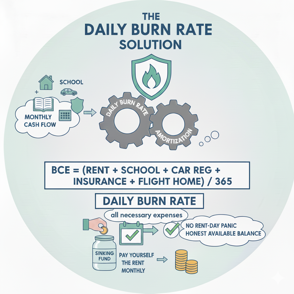 - The Finfigs Solution: The “Daily Burn Rate” Amortization Finfigs solves this by shifting your perspective from “Monthly Cash Flow” to “Accrual Accounting.” You must calculate your Base Cost of Existence (BCE). Add up every annual non-negotiable: Rent, School Fees, Car Registration, Insurance, and the “Annual Flight Home.” Divide that total by 365. This is your “Daily Burn Rate”—the amount it costs you just to wake up in the UAE. Every month, regardless of when the cheque is due, you must move that monthly portion into a dedicated “Sinking Fund” account. By “paying yourself the rent” every single month, you transform a terrifying 50k cheque into a manageable monthly line item. This prevents the “Rent-Day Panic” and ensures your “Available Balance” is an honest reflection of your spending power.