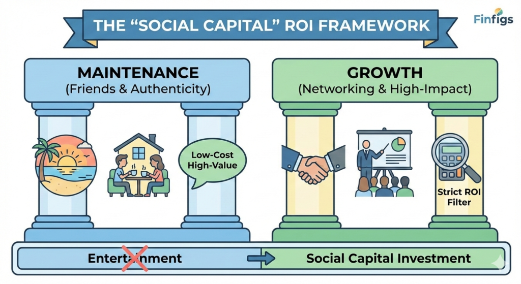 - The Finfigs Solution: The “Social Capital” ROI Framework Instead of the “just don’t go” advice that fails in a social city like Dubai, Finfigs suggests treating social spending as a High-Impact Investment. Categorize your outings into “Maintenance” (friends) and “Growth” (professional networking). For “Maintenance,” suggest “Low-Cost High-Value” alternatives like beach sunsets or home gatherings, which are becoming a major trend in 2025 as residents seek authenticity. For “Growth,” set a strict “ROI Filter”: If an event costs AED 500, ask yourself if it provides a clear networking opportunity or mental health reset. By labeling this as “Social Capital” in your tracker rather than “Entertainment,” you remove the guilt but gain the discipline to choose one high-value event over four meaningless ones.